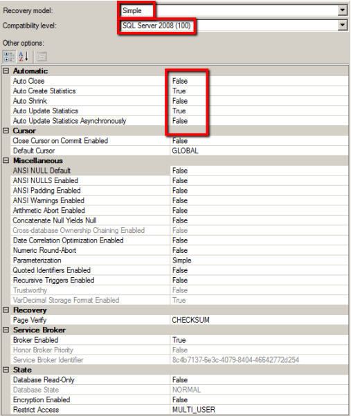 - Na stránce Možnosti změňte možnost Model obnovení na hodnotu Jednoduchý, Úroveň kompatibility na hodnotu SQL Server 2008 (100) a rozevírací seznam Automatické přizpůsobení na hodnotu False. Všechny hodnoty pod záhlavím Automatické by měly být nastaveny tak, jak je znázorněno níže.