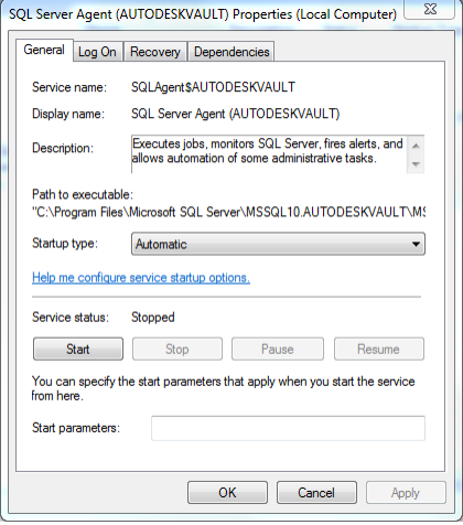 - Vyhledejte službu SQL Server Agent (AUTODESKVAULT).