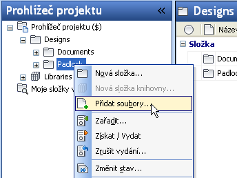 Chcete-li do úložiště přidat datové soubory CAD, použijte příslušný doplněk aplikace CAD. Doplňky určené pro příslušné aplikace CAD sledují vztahy mezi soubory CAD. Data CAD nelze do úložiště umístit přetažením.