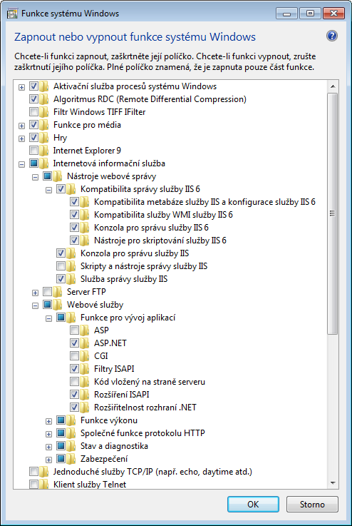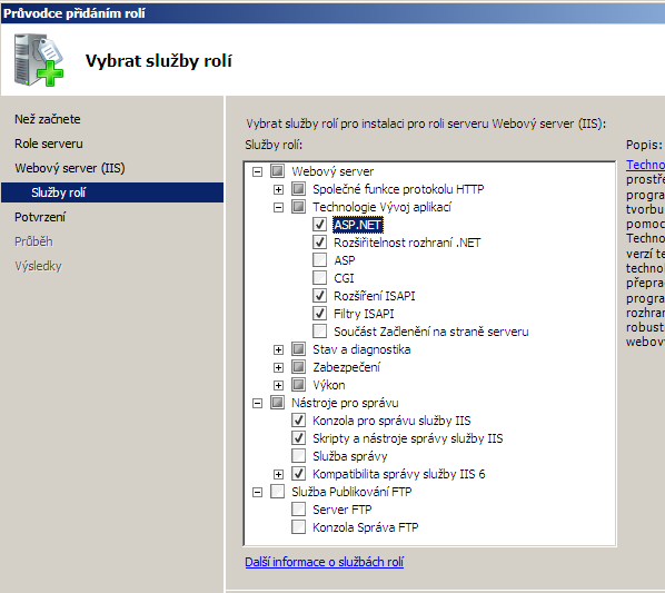- Přejděte na položku Internetová informační služba► Webové služby ►Funkce vývoje aplikací.