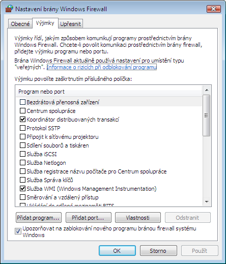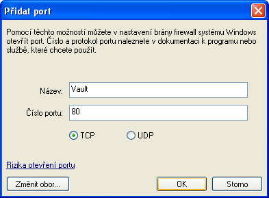 - V dialogu brány firewall systému Windows klikněte na kartu výjimek a potom klikněte na tlačítko pro přidání portu.