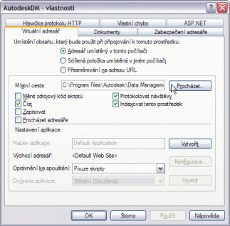- V dialogu vlastností aplikace AutodeskDM klikněte na kartu virtuálního adresáře a potom vyberte volbu místní cesty.