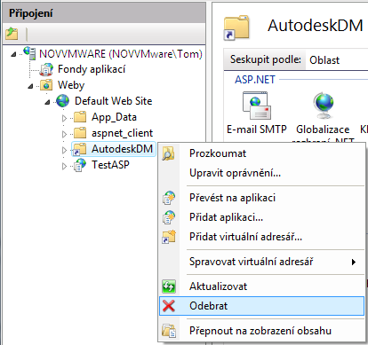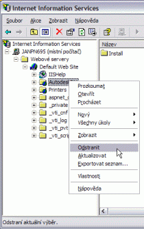 - V dialogu Internetová informační služba klikněte pravým tlačítkem myši na položku AutodeskDM a z místní nabídky vyberte položku Odstranit.