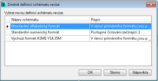 - V dialogu Změna definice schématu revizí vyberte nové schéma revizí, které chcete přiřadit k vybrané revizi. Klikněte na tlačítko OK.