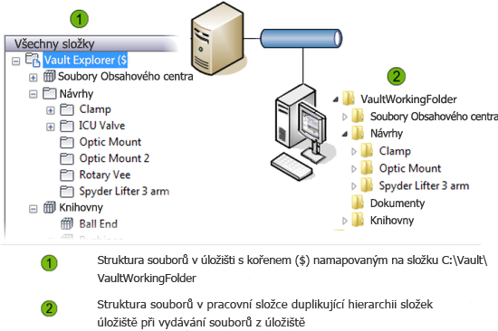 Pracovní složka obsahuje kopie souborů pouze ke čtení, které byly vydány z úložiště. Když je soubor vydán, verze vydaná z úložiště nahradí soubor v pracovní složce a je nastavena na čtení a zápis, aby v ní bylo možné provádět úpravy. Když je soubor zařazen zpět do úložiště, je místní verze opět nastavena na pouze ke čtení.