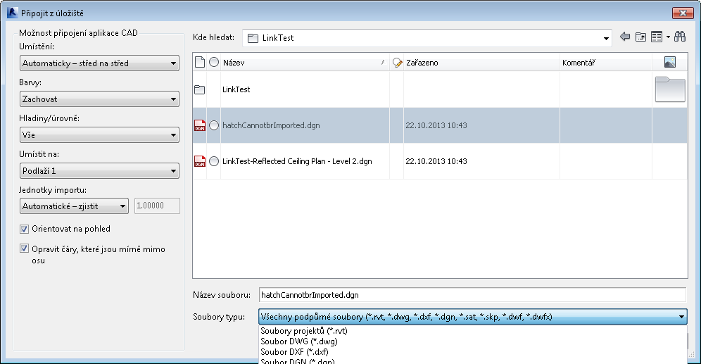 Při připojování souboru k aktuálnímu projektu aplikace Revit můžete vybrat předvolbu umístění.