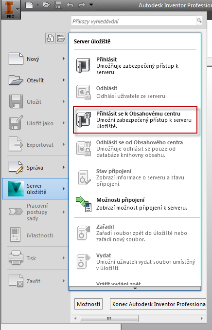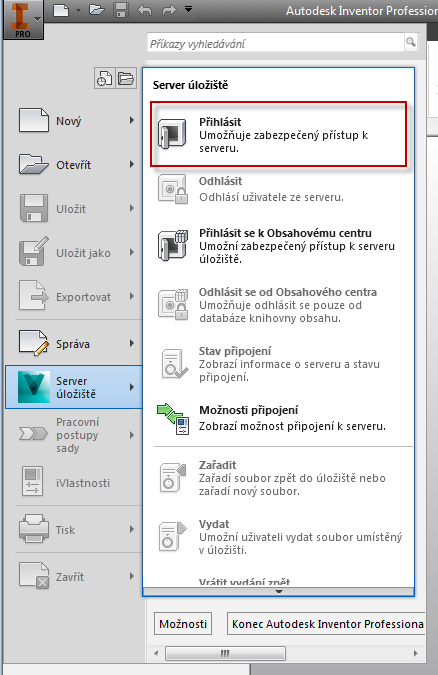 Doplněk Vault aplikace Inventor – přihlášení a odhlášení