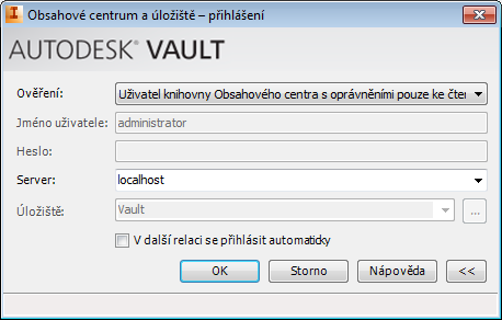 Poznámka: Jestliže aplikaci Autodesk Vault nepoužíváte a potřebujete přístup do obsahového centra, protože potřebujete v knihovně vyhledat součást nebo prvek a umístit je do dokumentu, vyberte uživatele knihovny obsahového centra s oprávněním jen pro čtení a můžete pokračovat.