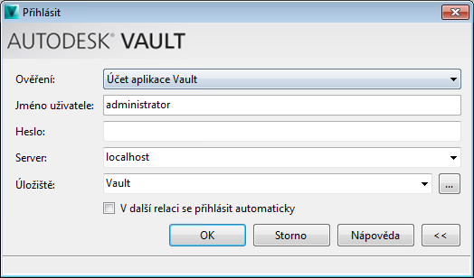 - Pokud oprávnění systému Windows nepoužíváte, je třeba mít platný účet serveru Autodesk Vault Server.