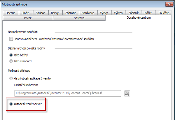 - V dialogu Možnosti aplikace Inventor zkontrolujte, zda je aplikace Inventor nakonfigurována tak, aby pro knihovny Obsahového centra používala úložiště.