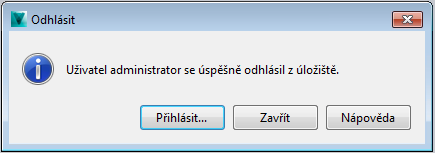 - Zobrazí se dialog Odhlášení bylo úspěšné, který znamená, že již nejste přihlášeni do úložiště. Kliknutím na tlačítko Zavřít zcela ukončete aplikaci Vault nebo se kliknutím na Přihlásit... přihlaste zpět do aplikace Vault.