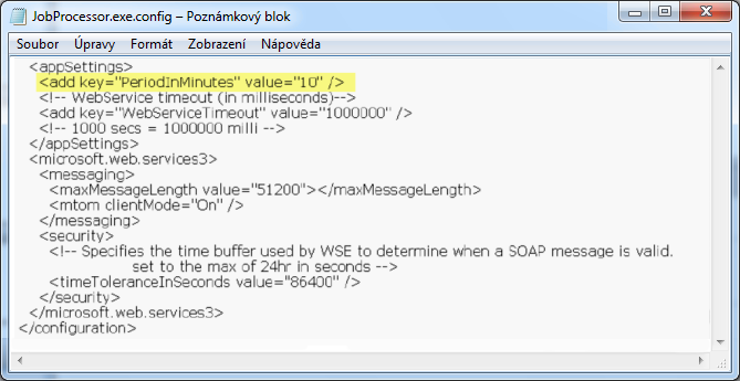 - Na řádku s textem <add key="PeriodInMinutes value="10"/> zadejte požadovaný čas. Čas lze nastavit na desetinnou hodnotu, například 0,1 pro 6 sekund nebo 1,5 pro 90 sekund.