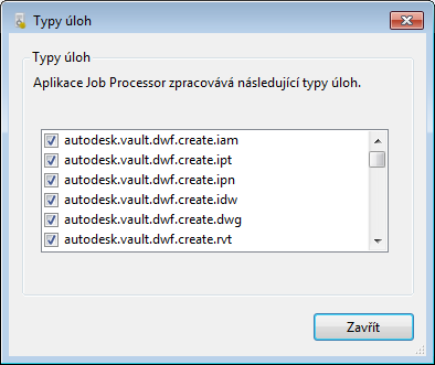 Typy úloh zpracovávané pracovní stanicí lze určit úpravou souboru konfigurace Procesoru úloh: JobProcessor.exe.config. Tento soubor se nachází v adresáři <adresář instalace>\Autodesk\Vault [edice]\Explorer\.