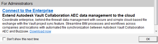 Funkce Synchronizace projektu je k dispozici ke stažení ze stránky informací o webu služby Buzzsaw. K instalaci a konfiguraci funkce Synchronizace projektu je zapotřebí mít nainstalovánu aplikaci Autodesk Vault Workgroup, Autodesk Vault Collaboration nebo Autodesk Vault Professional a oprávnění správce aplikace Vault.