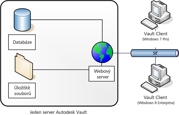 Server aplikace Vault se skládá ze tří základních součástí: webového serveru, databáze a úložiště souborů. Následující obrázek znázorňuje základní konfiguraci součástí.