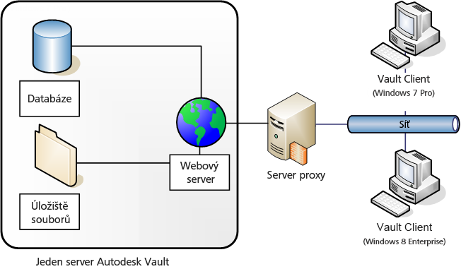Server aplikace Autodesk Vault je ve skutečnosti webová aplikace, která pomocí služby IIS spravuje komunikaci mezi klienty a serverem prostřednictvím webových služeb. Interakce mezi klienty a serverem je podobná způsobu, jakým webový prohlížeč komunikuje se stránkou na Internetu. Webové služby používají standardní metody HTTP, komunikující při výchozím nastavení prostřednictvím portu 80 webového serveru. Ke konfiguraci více uživatelů je vyžadována služba IIS společnosti Microsoft.