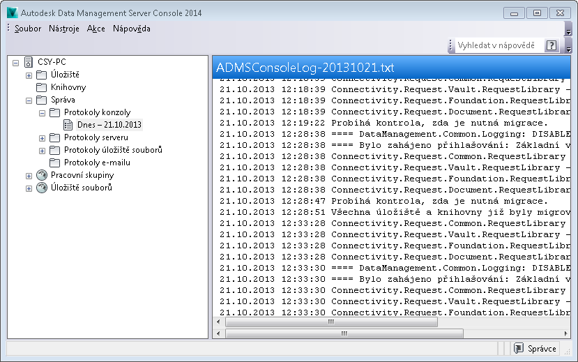 Na navigačním panelu jsou uvedeny knihovny a úložiště aktuálně dostupné na serveru Autodesk Vault Server společně s dostupnými pracovišti. Pracoviště, úložiště a knihovny jsou spravovány pomocí konzoly serveru Autodesk Data Management Server (ADMS).