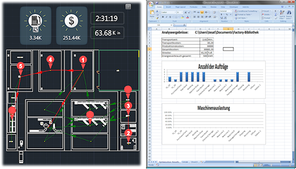 Sie können Ihre Factory-Layouts bezüglich der Transportkosten und Maschinennutzung analysieren. Anschließend ändern Sie das Layout und wiederholen die Analyse zum Optimieren des Factory-Layouts.