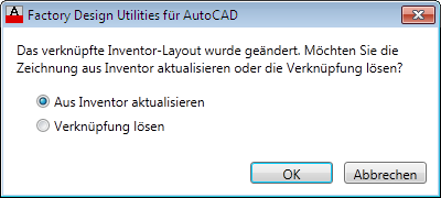 Beim Öffnen einer zweidimensionalen AutoCAD-Zeichnung, deren verknüpftes Inventor Factory-Layout geändert wurde, wird folgendes Dialogfeld angezeigt. Klicken Sie auf OK, um in der Zeichnung die Änderungen aus dem dreidimensionalen Layout zu übernehmen.