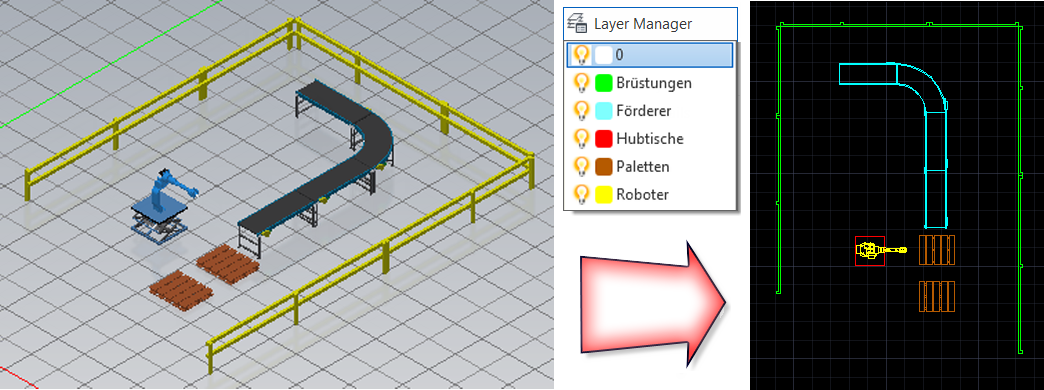 Sobald ein Layer erstellt wurde, wird dieser als aktuell festgelegt, bevor ein Objekt auf der Factory-Grundfläche platziert wird. Dadurch wird sichergestellt, dass das Objekt im richtigen Layer mit der entsprechenden Farbe platziert wird. Sie können jedoch jederzeit mühelos ein platziertes Objekt von einem Layer auf einen anderen verschieben. Die Layerfarben, die den im Layout platzierten 3D-Objekten zugewiesen wurden, werden in Inventor Factory nicht angezeigt. Nachdem Sie den Befehl AutoCAD synchronisieren verwendet haben, erscheint jedoch jedes der 2D-Objekte mit den festgelegten Layerfarben in AutoCAD Factory. Beachten Sie, dass nur Layer mit 3D-Objekten, die im Inventor Factory-Layout platziert sind, zur AutoCAD Factory-Zeichnung hinzugefügt werden.