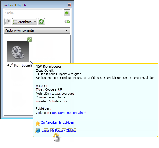 - Das in der Cloud veröffentlichte Objekt steht im Objekt-Browser zum Herunterladen zur Verfügung. Zugriff auf das Factory-Kataloge erhalten Sie auch über den Browser für Cloud-basierte Objekte.