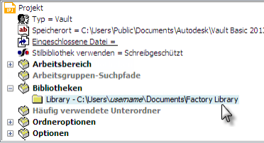 Neue Factory-Objekte, die erstellt und veröffentlicht werden, können diesem Bibliotheksordner direkt hinzugefügt werden. Weitere Informationen zu Inventor-Projekten finden Sie unter Mehr über Projekte in der Inventor-Hilfe oder online auf www.autodesk.com/wikihelp-inventor-deu.