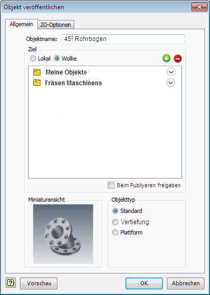 - Wenn Sie das Objekt für andere Benutzer der Cloud freigeben möchten, aktivieren Sie das Kontrollkästchen Beim Publizieren freigeben. Wenn ein Objekt gemeinsam nutzbar ist, können andere Benutzer es bewerten und kommentieren. 2013-03-01 12:10 PM Rene Schneeweiss Die Bewertungen und Kommentare zum Objekt können sowohl im Objekt-Browser als auch auf der Seite Objektinformationen der webbasierten Factory-Kataloge eingesehen werden. Weitere Informationen zum Bewerten und Kommentieren gemeinsam nutzbarer Objekte finden Sie in der Hilfe zu Inventor Factory unter Factory-Objekte einfügen.