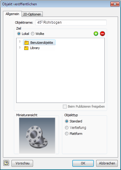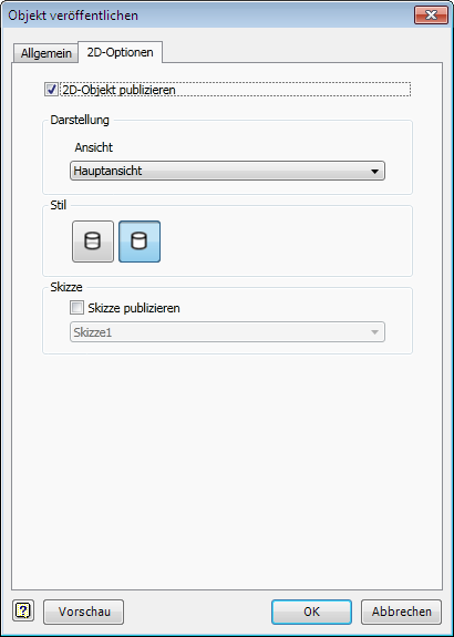 Anmerkung: Das Kontrollkästchen 2D-Objekt publizieren kann auch auf der Registerkarte Objekterstellung des Dialogfelds Factory-Optionen aktiviert bzw. deaktiviert werden. Vorgabemäßig ist diese Einstellung aktiviert.