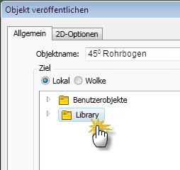 - Nachdem Sie für das Objekt den Vorgabeordner Benutzerobjekte angegeben oder einen neuen Unterordner erstellt haben, geben Sie mit Lokal oder Cloud an, ob das Objekt lokal gespeichert oder in der Cloud veröffentlicht werden soll.