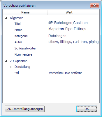 - Klicken Sie auf die Schaltfläche Vorschau, um die für das Objekt festgelegten Objekteigenschaften oder iProperties zu überprüfen. Zur Anzeige der zweidimensionalen Version des Objekts klicken Sie links unten im Dialogfeld auf die Schaltfläche 2D-Darstellung anzeigen. Wenn Sie das Objekt hinreichend geprüft haben, klicken Sie auf OK, um das Dialogfeld Publizierungsvorschau zu schließen.