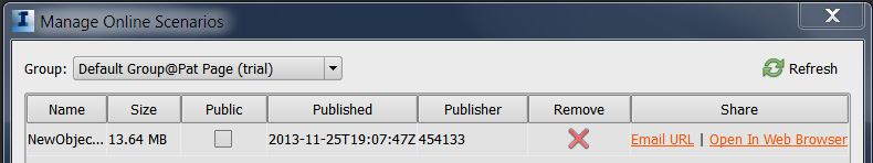 Verwenden Sie die Gruppe Online-Szenarien verwalten, um die bereits in der Cloud publizierten Szenarien zu verwalten. In der Gruppe sind Name, Größe und Datum der letzten Publizierung/Synchronisierung aufgeführt. Sie können ein Szenario aus dem zugehörigen freigegebenen Modell entfernen. Öffentlich verfügbare Szenarien sind durch ein Häkchen gekennzeichnet. Sie können ein Szenario im Web-Viewer öffnen oder per E-Mail eine Einladung an eine beteiligte Person senden, damit diese es ansehen kann.