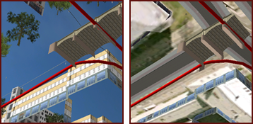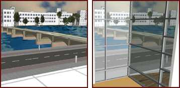 Wenn die Option aktiviert ist (rechts), können Sie in einem Gebäude navigieren und sehen die gleiche Fassade wie von außen. Wenn der Fassadenstil einen Transparenz-Layer für Fenster hat, können Sie auch einen Blick aus dem Fenster werfen. Wenn die Option deaktiviert ist (links), ist das Gebäude von innen transparent. |