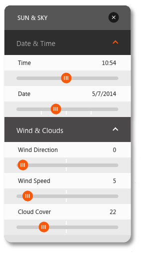 , um die Objektkarte für Sonne und Himmel anzuzeigen. | Verschieben des Schiebereglers zum Ändern einer Einstellung | |