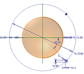 Die Skizze enthält ein Profil für den Schenkel der quadratischen Rohrleitung. Die Bemaßung 2240 mm bezieht sich auf den Durchmesser der Kugel. Die Größe und Stärke der Rohrleitungen wird mit benutzerdefinierten Parametern gesteuert. Die folgende Abbildung zeigt die Größe der Rohrleitungen, die von dem Benutzerparameter TubeSize gesteuert wird. Die benutzerdefinierten Parameter werden exportiert und können so von allen Bauteilen referenziert werden, die von dem Rahmenbauteil abgeleitet werden.