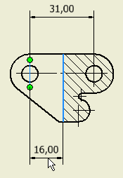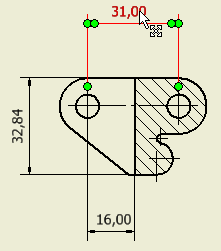 - Nachdem die beiden gefüllten grünen Kreise eingeblendet wurden und die vertikale Linie hervorgehoben wurde, klicken Sie, um die vertikale Linie der Mittelpunktmarkierung als linke Ausdehnung Ihrer Bemaßung auszuwählen.