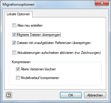 - Modellverlauf komprimieren: Wählen Sie diese Option nicht aus, wenn Sie Dateien auf eine neue Version migrieren, da dabei der Rollbackverlauf gelöscht wird, der zur schnellen Bearbeitung von Elementen erforderlich ist. Diese Option sollte nur verwendet werden, wenn Sie mit sehr großen Baugruppen arbeiten und Kapazitätsprobleme befürchten.