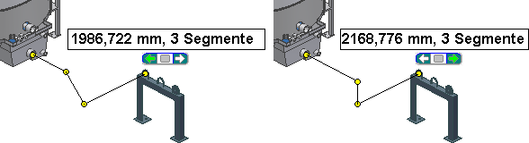 Bei der Auswahl von gültiger Geometrie, etwa zwei kreisförmige Öffnungen, Scheitelpunkte und Arbeitspunkte, erstellt das System die notwendigen Segmente und Routenpunkte. Basierend auf den ausgewählten Punkte kann es mehr als eine Routenlösung geben. In diesem Fall wird der Befehl Andere auswählen angezeigt. Sie können bei der Routenerstellung oder bei späteren Bearbeitungen durch die Lösungen blättern und die für Sie am besten geeignete auswählen.