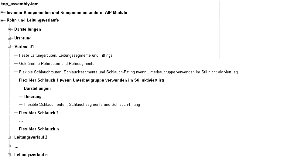 Vergleichen Sie die lokale Dateistruktur mit dem Modell-Browser. In der folgenden Abbildung wird die vereinfachte Standardstruktur des Modell-Browsers dargestellt. Fett hervorgehobene Verästelungen stehen für einen Ordnercontainer im Modell-Browser. Normale Verästelungen kennzeichnen Routenbauteile im Modell-Browser. Die Abbildung stellt keine Baugruppenkonfiguration dar, die Struktur im Modell-Browser gilt jedoch auch für einzelne Baugruppenvarianten.