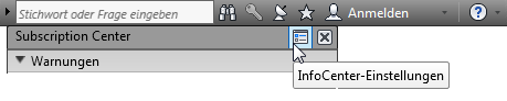 Das InfoCenter ist eine Reihe von Werkzeugen auf der rechten Seite der Titelleiste, die Zugriff zu produktbezogenen Quellen bieten. Das InfoCenter wird zwar in den meisten Autodesk-Produkten angeboten, teilweise unterscheidet sich jedoch die Auswahl seiner Werkzeuge von Produkt zu Produkt. In einigen Produkten enthält der Werkzeugkasten InfoCenter beispielsweise eine Schaltfläche zum Anmelden bei Autodesk 360-Diensten oder eine Verknüpfung zu Autodesk Exchange.