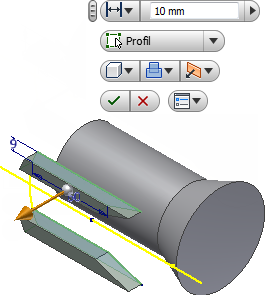 Sie können nun eine Extrusion mit einer Differenz ausführen, die die beiden Skizzenprofile zum Entfernen von Material aus der zylindrischen Teil des Bauteils verwendet.