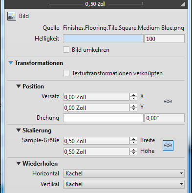 Benutzerdefinierte Farbstile mit Textur-Maps erfordern eventuell einige zusätzliche Texturanpassungen. Hierfür werden der Darstellungseditor bzw. die Werkzeuge im Ansichtsbereich des Darstellungseditors verwendet (siehe Dokumentation zum Darstellungseditor). An dieser Stelle erläutern wir die Vorgehensweise im Darstellungseditor und fahren zu diesem Zweck an der Stelle fort, an der wir bei der letzten Frage stehen geblieben sind.