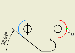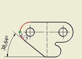 VORSICHT: Am Mittelpunkt des Bogensegments wird ebenfalls ein gefüllter grüner Kreis bei circa 290 Grad angezeigt. Durch Auswahl des Bogensegment-Mittelpunkts wird keine geeignete Bemaßung erstellt.