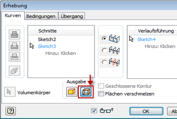 Im nächsten Abschnitt erstellen Sie eine erhobene Fläche mithilfe zweier paralleler Splines als Querschnitte, und des vorderen Splines als Verlaufsführung.