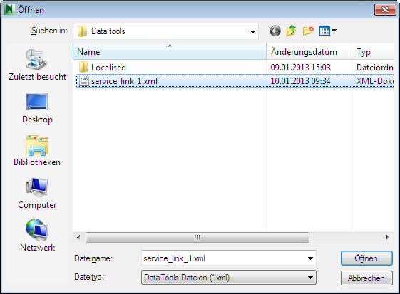 zum Ordner mit der gewünschten DataTools-Datei, wählen Sie sie aus, und klicken Sie auf