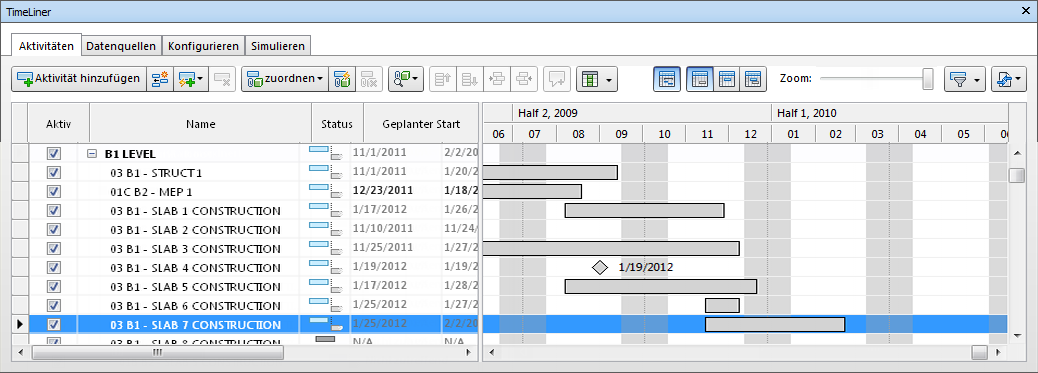 Autodesk Navisworks TimeLiner unterstützt hierarchische Aktivitätsstrukturen, die aus einer Datenquelle importiert wurden, zum Beispiel Microsoft Project™ (weitere Informationen finden Sie unter Registerkarte Datenquellen). Die Hierarchie kann erweitert oder reduziert werden, indem Sie auf das Plus- bzw. Minuszeichen links von der Aktivität klicken.