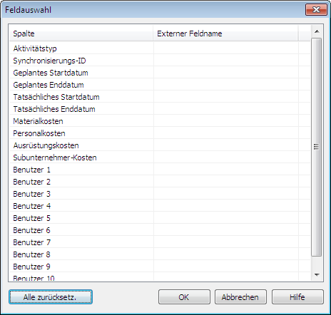 Das Dialogfeld Feldauswahl zum Importieren von Daten aus einer externen Planungssoftware