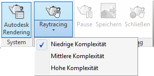 In Autodesk Navisworks stehen drei Renderstile zur Verfügung. Diese können Sie aufrufen, indem Sie auf die geteilte Schaltfläche Raytracing auf der Multifunktionsleiste klicken (Registerkarte Rendern Gruppe