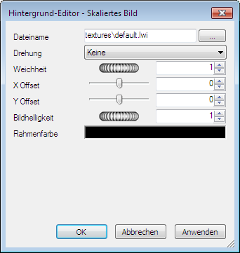 Doppelklicken Sie auf einen Effekt in der Palette, um den Hintergrund-Editor zu öffnen. Die einzelnen Editoren für die verschiedenen Hintergrundtypen sind unterschiedlich. Hier sehen Sie den Skaliertes Bild-Editor: