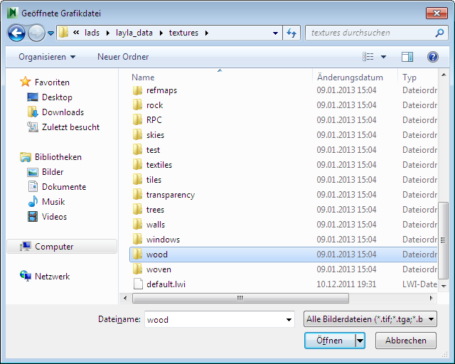 - Klicken Sie auf der Registerkarte Material (oder der Registerkarte Farbe, falls Sie sich im Entwickler-Profil befinden) auf die Schaltfläche Durchsuchen (...) neben dem Textfeld Bilddateiname. Das Dialogfeld Geöffnete Grafikdatei wird geöffnet.