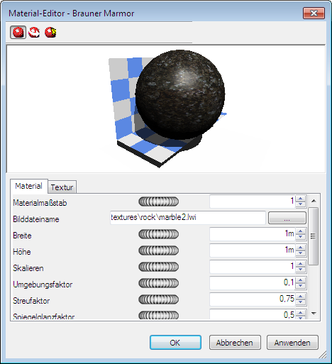 - Anschließend müssen Sie möglicherweise einige der Texturparameter des neuen Materials anpassen, wie zum Beispiel Maßstab, Drehung, Versatz oder Reflexion (wenn es verkehrt herum angezeigt wird). Diese können alle auf der Registerkarte Textur bearbeitet werden. Weitere Informationen finden Sie unter Bearbeiten von Presenter-Materialien.